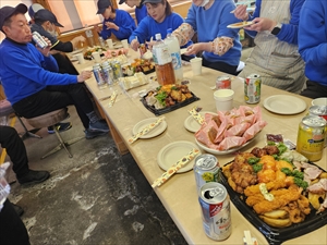 先代社長夫妻も交え、ささやかながら記念の懇親会を社員さんたちと工場内で行い、2人の長年の労を労いました。
