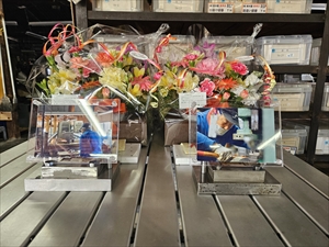 (花と共に金型で作ったフォトスタンドをプレゼント)